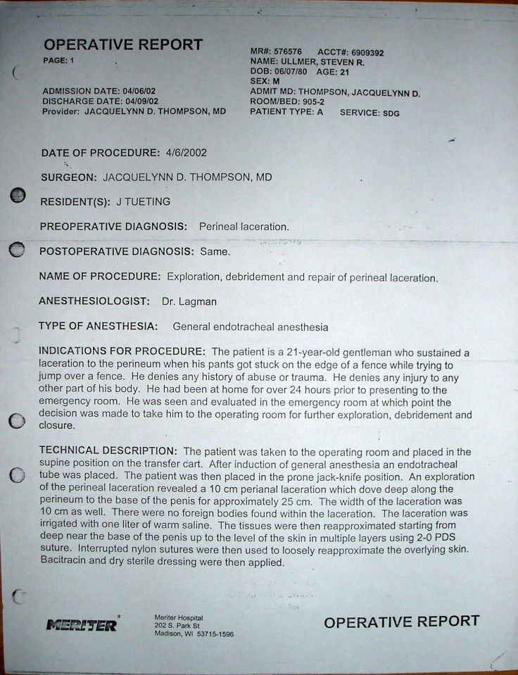 At the hospital, I waited in the Emergency Room to be admitted and examined. They asked a lot of questions, and were very skeptical of my story. I told them I hurt myself trying to climb a fence, but they kept asking if someone had attacked me or stabbed me. Every person that looked at my injury went to go get someone else, and finally they concluded that I needed to have surgery immediately. Since it had been nearly twenty-four hours since the injury occurred, and the wound had not been properly cleaned, the doctors wanted to act quickly because they believed the risk of infection was high. Dr. Jacquelynn Thompson (now Jacquelynn Arbuckle) was the surgeon on call that Saturday night, so we waited for her to arrive while I was prepped for surgery. I had to call my dad for insurance purposes, and also called my girlfriend Wendy. I was ashamed and scared, but did my best to hide it.